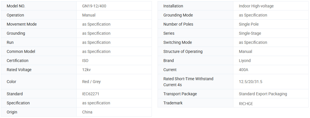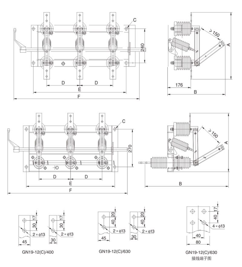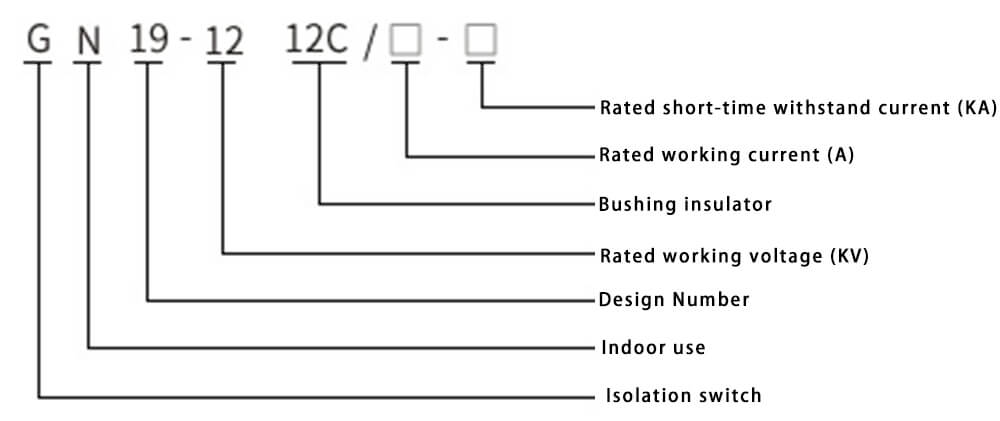 GN19-12(C) உட்புற HV துண்டிப்பு சுவிட்ச் மதிப்பிடப்பட்ட மின்னழுத்தம் 12kV, AC 50/60Hz மின் அமைப்புக்கு பொருந்தும். இது CS6-1 மேனுவல்-ஆப்பரேட்டிங் பொறிமுறையுடன் பொருத்தப்பட்டுள்ளது மற்றும் சுமை இல்லாத நிலையில் சுற்றை உடைத்து உருவாக்க பயன்படுகிறது. கூடுதல் மாசு வகை, உயரமான வகை மற்றும் சக்தியைக் குறிக்கும் வகை ஆகியவை உள்ளன. இது IEC 62271-102 இன் படி உருவாக்கப்பட்டது. இந்தத் தொடரின் தனிமைப்படுத்தும் சுவிட்ச் ஒரு CS6-1 கைமுறை இயக்க பொறிமுறையுடன் பொருத்தப்பட்டுள்ளது (ஒரு பேனலுடன் தனிமைப்படுத்தும் சுவிட்ச் அதன் சொந்த இணைந்த இயக்க நுட்பத்தைக் கொண்டுள்ளது).   தனிமைப்படுத்தும் சுவிட்சுகளின் இந்தத் தொடர் மூன்று துருவ வகையாகும், இதில் ஒரு சேஸ், ஒரு சுழலும் தண்டு, ஒரு நெம்புகோல், ஒரு பீங்கான் தூண் இன்சுலேட்டர், ஒரு கத்தி மற்றும் ஒரு வயரிங் போர்டு ஆகியவை அடங்கும். சுழலும் தண்டு கீழ் சட்டத்தில் ஏற்பாடு செய்யப்பட்டுள்ளது, அதில் மூன்று ஜோடி நெம்புகோல்கள் பற்றவைக்கப்படுகின்றன, மேலும் நெம்புகோல்கள் இழுக்கும் கம்பி பீங்கான் இன்சுலேட்டர் மற்றும் கத்தி நெக்லஸ் வழியாக செல்கின்றன. சுழலும் தண்டு அடிப்படை சட்டத்திற்கு வெளியே நீண்டுள்ளது, மேலும் சுழலும் தண்டின் எந்தப் பகுதியையும் இயக்க பொறிமுறையுடன் இணைக்க முடியும்.   வகை சி சுவர் வழியாக உள்ளது. அவற்றில், C1 என்பது சுவரின் வழியாக பக்கவாட்டில் உள்ளது என்று அர்த்தம்; C2 என்றால் துண்டிப்பு சுவர் வழியாக பக்கத்தில் உள்ளது; C3 என்பது சுவர் வழியாக இருபுறமும் பக்கவாட்டில் இருப்பதைக் குறிக்கிறது.