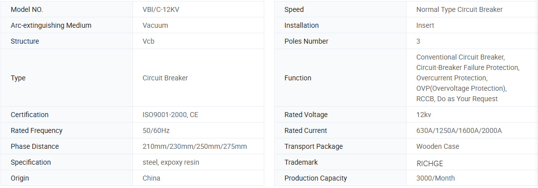 விபிஐ -12 நடுத்தர மின்னழுத்த வெற்றிட சர்க்யூட் பிரேக்கர் என்பது 50 ஹெர்ட்ஸ்/60 ஹெர்ட்ஸ் மூன்று கட்ட ஏசி 12 கி.வி மதிப்பிடப்பட்ட மின்னழுத்தத்துடன் ஒரு வகையான உட்புற நடுத்தர மின்னழுத்த சுவிட்ச் கருவியாகும், இது சுவிட்சர்லாந்தில் ஏபிபி கார்ப்பரேஷனின் தொழில்நுட்பத்தை இணைத்து சீனாவில் உருவாக்கப்பட்டது. தயாரிப்பு நிலையான GB1984 & IEC62271-100 உடன் இணங்குகிறது.