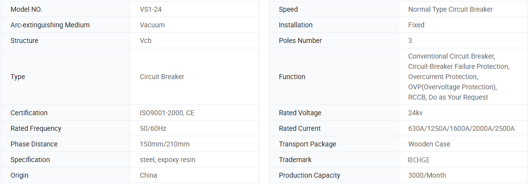 VS1-24 VCB என்பது ஒரு வகையான உட்புற உயர் மின்னழுத்த சுவிட்ச் சாதனமாகும், இது பாதுகாப்பு மற்றும் கட்டுப்பாட்டு அலகு என, 50 ஹெர்ட்ஸ், மதிப்பிடப்பட்ட மின்னழுத்தம் 24KV இன் ஏசி மூன்று-கட்ட சக்தி அமைப்பில் பயன்படுத்தப்படுகிறது. விஎஸ் 1 தொடரில் சிறிய அளவு, நம்பகமான காப்பு, மாசு மற்றும் நீண்ட கால இலவச பராமரிப்பு போன்றவற்றின் நன்மைகள் உள்ளன. வசந்த இயக்க வழிமுறைகளுக்கான மட்டு வடிவமைப்புடன், விஎஸ் 1 வெற்றிட சர்க்யூட் பிரேக்கர்கள் ஒரு நிலையான நிறுவல் அலகு அல்லது பிரத்யேக உந்துதல் கட்டமைப்பைக் கொண்ட திரும்பப் பெறக்கூடிய அலகு.
