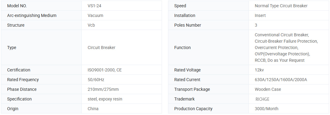 பொதுவான காப்பிடப்பட்ட சிலிண்டருடன் உட்புற உயர் மின்னழுத்த வெற்றிட சர்க்யூட் பிரேக்கரின் VS1-24 மூன்று-சொற்றொடர் A.C. 50 ஹெர்ட்ஸ் உட்புற மின் விநியோக உபகரணங்கள் 24KV இன் மதிப்பிடப்பட்ட மின்னழுத்தத்துடன். தொழில் மற்றும் சுரங்க நிறுவனங்கள், மின் உற்பத்தி நிலையங்கள் மற்றும் துணை மின்நிலையங்களில் மின் சாதனங்களைக் கட்டுப்படுத்துவதற்கு இது பயன்படுத்தப்படுகிறது. இந்த வகை வெற்றிட சர்க்யூட் பிரேக்கர் தேசிய தரநிலைகள் மற்றும் IEC தரத்தை நிபந்தனைக்கு இணங்குகிறது, திறன் M2-E2-C2 தரத்தை அடைகிறது.