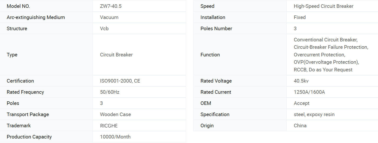 சர்க்யூட் பிரேக்கரின் முக்கிய பண்புகள் சிறந்த உடைக்கும் செயல்திறன், வெற்றிட வளைவு, அதிக உடைக்கும் திறன், 10000 மடங்கு வரை இயந்திர வாழ்க்கை, எளிய அமைப்பு, பராமரிப்பு இலவசம் மற்றும் நீண்ட பராமரிப்பு சுழற்சி; நல்ல காப்பு செயல்திறன் மற்றும் வலுவான மாசு எதிர்ப்பு திறன்; தற்போதைய மின்மாற்றிகள் வாடிக்கையாளர் தேவைகளுக்கு ஏற்ப நிறுவப்படலாம், 0.2 நிலை வரை அளவீட்டு துல்லியத்துடன், மூன்று கட்ட தொடர்புகளை செயல்படுத்துகிறது. தரநிலை: IEC 62271-100